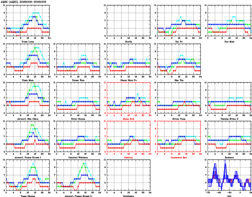 | Air Quality Data Time Series for AQHI (2018/10/09) | ( Line colors: Day -3 Day -2 Day -1 Current day ) | 2D Map Current AQHI |