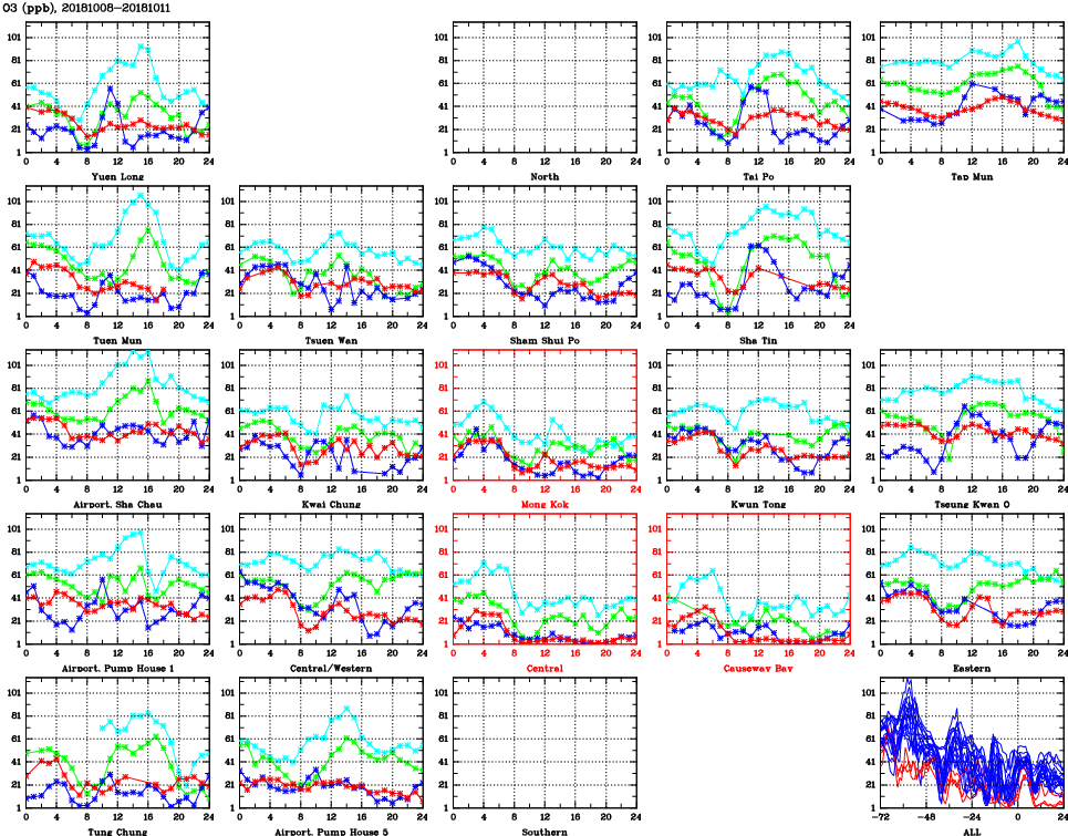| Air Quality Data Time Series for O3 (2018/10/11) | ( Line colors: Day -3 Day -2 Day -1 Current day ) | 2D Map Current AQHI |