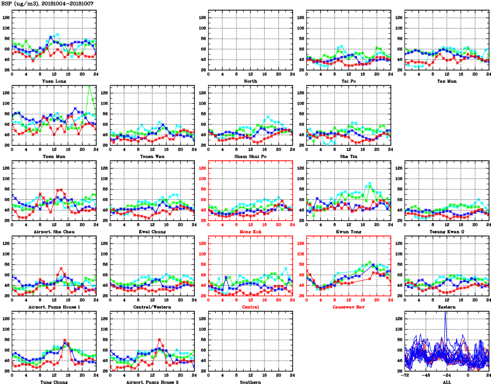 | Air Quality Data Time Series for RSP (2018/10/07) | ( Line colors: Day -3 Day -2 Day -1 Current day ) | 2D Map Current AQHI |