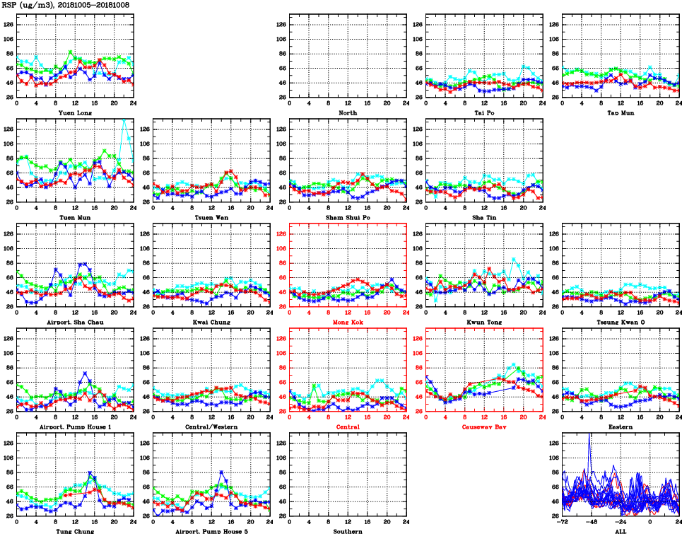 | Air Quality Data Time Series for RSP (2018/10/08) | ( Line colors: Day -3 Day -2 Day -1 Current day ) | 2D Map Current AQHI |