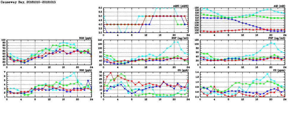 | Air Quality Data Time Series in Causeway Bay (2018/10/13) | ( Line colors: Day -3 Day -2 Day -1 Current day ) | 2D Map Current AQHI |