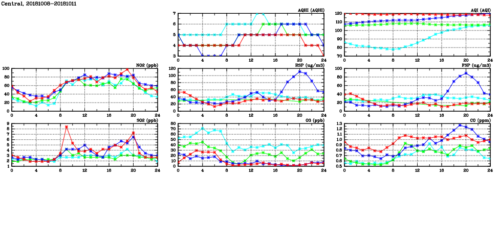 | Air Quality Data Time Series in Central (2018/10/11) | ( Line colors: Day -3 Day -2 Day -1 Current day ) | 2D Map Current AQHI |