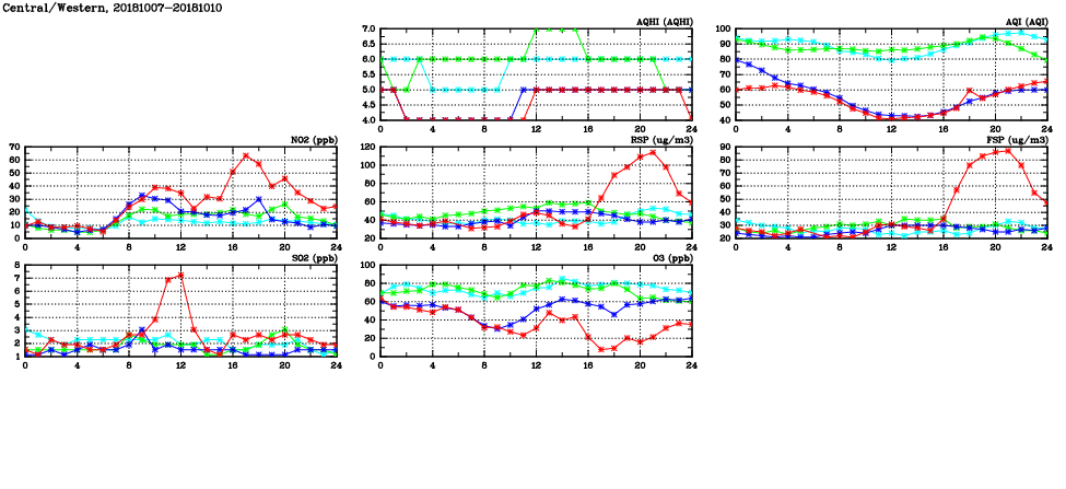 | Air Quality Data Time Series in Central/Western (2018/10/10) | ( Line colors: Day -3 Day -2 Day -1 Current day ) | 2D Map Current AQHI |