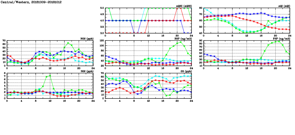 | Air Quality Data Time Series in Central/Western (2018/10/12) | ( Line colors: Day -3 Day -2 Day -1 Current day ) | 2D Map Current AQHI |