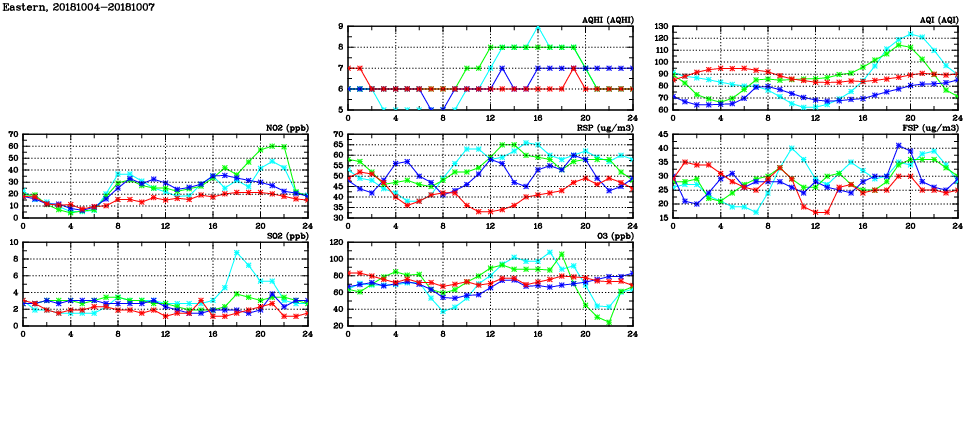 | Air Quality Data Time Series in Eastern (2018/10/07) | ( Line colors: Day -3 Day -2 Day -1 Current day ) | 2D Map Current AQHI |