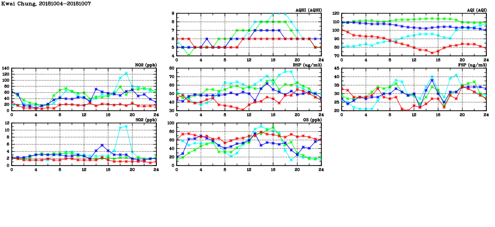 | Air Quality Data Time Series in Kwai Chung (2018/10/07) | ( Line colors: Day -3 Day -2 Day -1 Current day ) | 2D Map Current AQHI |