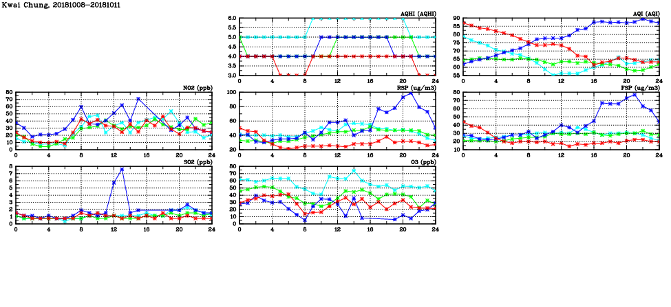 | Air Quality Data Time Series in Kwai Chung (2018/10/11) | ( Line colors: Day -3 Day -2 Day -1 Current day ) | 2D Map Current AQHI |