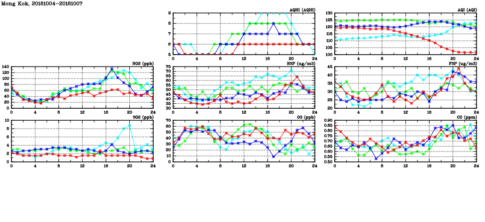 | Air Quality Data Time Series in Mong Kok (2018/10/07) | ( Line colors: Day -3 Day -2 Day -1 Current day ) | 2D Map Current AQHI |