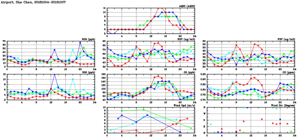 | Air Quality Data Time Series in Airport, Sha Chau (2018/10/07) | ( Line colors: Day -3 Day -2 Day -1 Current day ) | 2D Map Current AQHI |