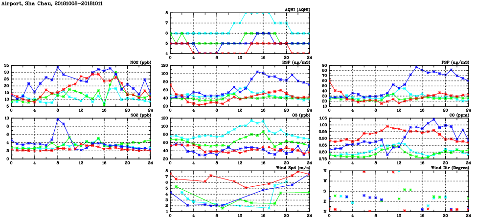 | Air Quality Data Time Series in Airport, Sha Chau (2018/10/11) | ( Line colors: Day -3 Day -2 Day -1 Current day ) | 2D Map Current AQHI |