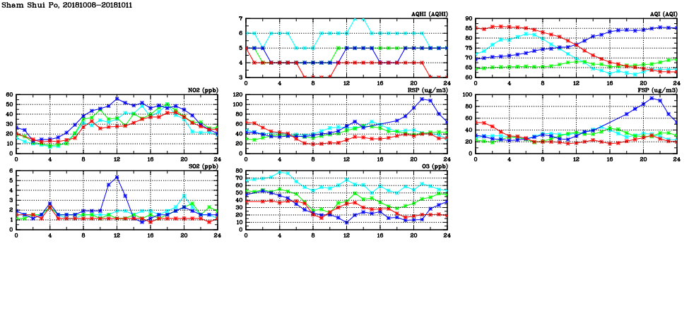 | Air Quality Data Time Series in Sham Shui Po (2018/10/11) | ( Line colors: Day -3 Day -2 Day -1 Current day ) | 2D Map Current AQHI |