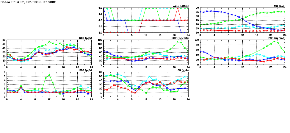 | Air Quality Data Time Series in Sham Shui Po (2018/10/12) | ( Line colors: Day -3 Day -2 Day -1 Current day ) | 2D Map Current AQHI |