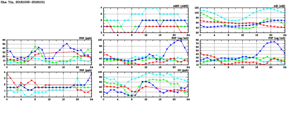 | Air Quality Data Time Series in Sha Tin (2018/10/11) | ( Line colors: Day -3 Day -2 Day -1 Current day ) | 2D Map Current AQHI |