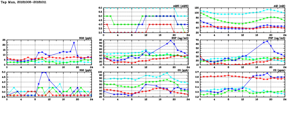 | Air Quality Data Time Series in Tap Mun (2018/10/11) | ( Line colors: Day -3 Day -2 Day -1 Current day ) | 2D Map Current AQHI |