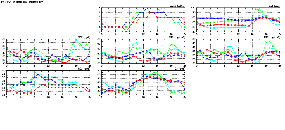 | Air Quality Data Time Series in Tai Po (2018/10/07) | ( Line colors: Day -3 Day -2 Day -1 Current day ) | 2D Map Current AQHI |