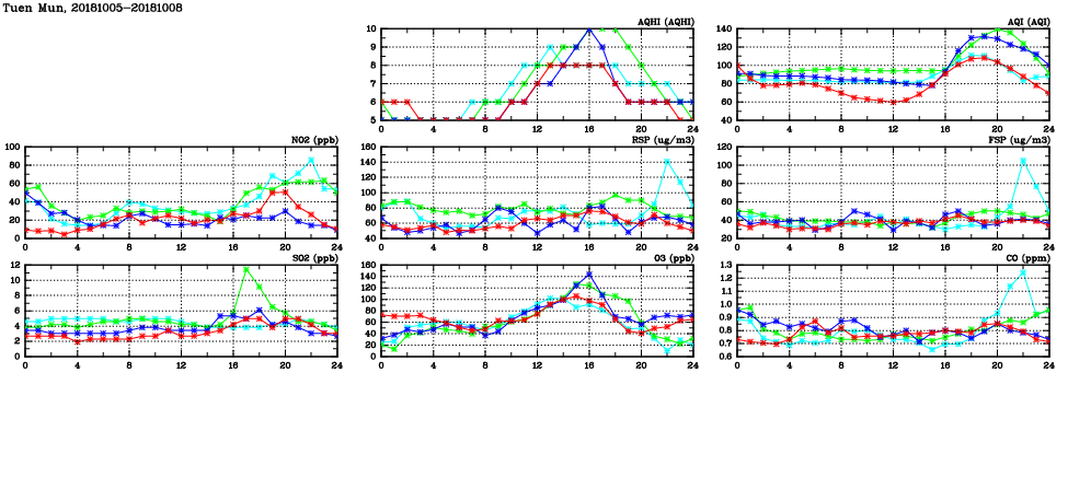 | Air Quality Data Time Series in Tuen Mun (2018/10/08) | ( Line colors: Day -3 Day -2 Day -1 Current day ) | 2D Map Current AQHI |