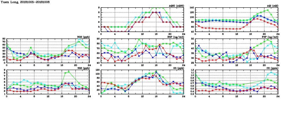 | Air Quality Data Time Series in Yuen Long (2018/10/08) | ( Line colors: Day -3 Day -2 Day -1 Current day ) | 2D Map Current AQHI |