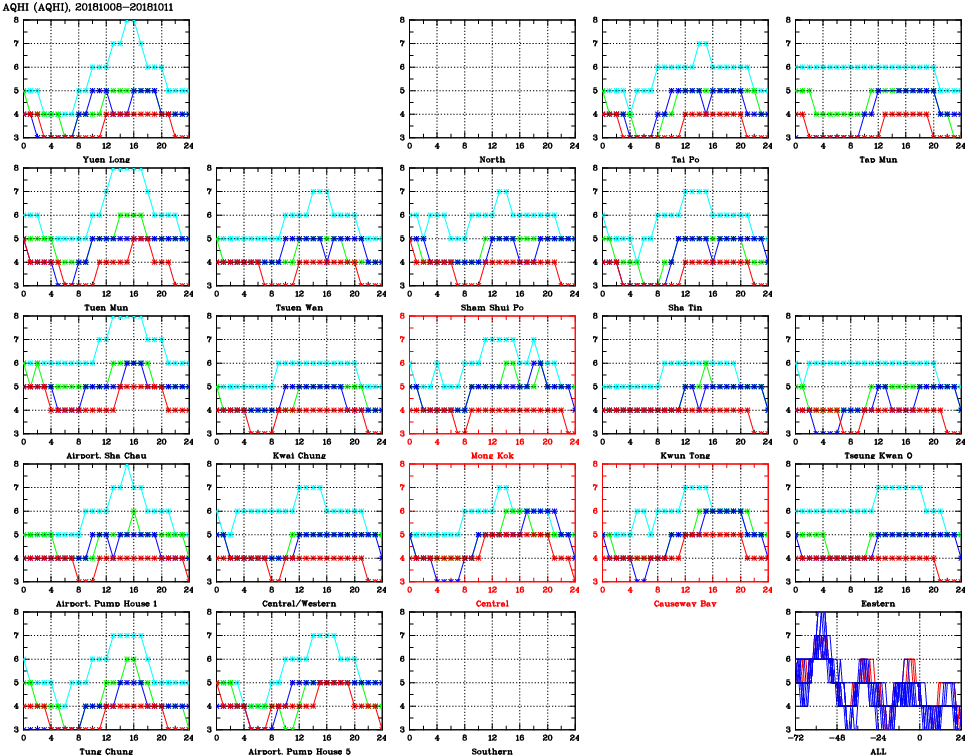 | Air Quality Data Time Series for AQHI (2018/10/11) | ( Line colors: Day -3 Day -2 Day -1 Current day ) | 2D Map Current AQHI |