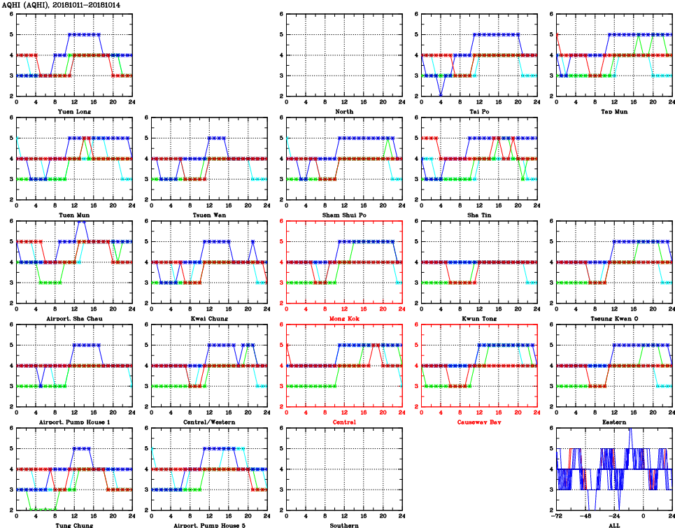 | Air Quality Data Time Series for AQHI (2018/10/14) | ( Line colors: Day -3 Day -2 Day -1 Current day ) | 2D Map Current AQHI |