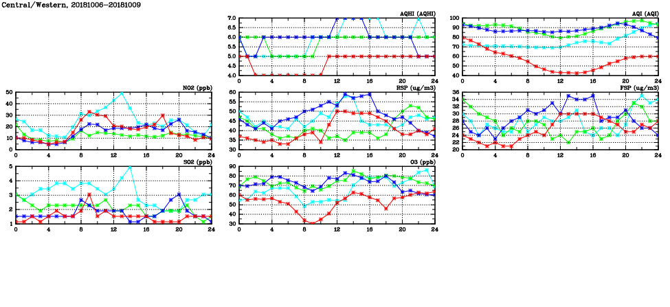 | Air Quality Data Time Series in Central/Western (2018/10/09) | ( Line colors: Day -3 Day -2 Day -1 Current day ) | 2D Map Current AQHI |