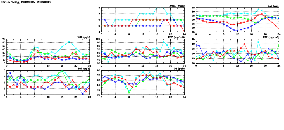 | Air Quality Data Time Series in Kwun Tong (2018/10/08) | ( Line colors: Day -3 Day -2 Day -1 Current day ) | 2D Map Current AQHI |