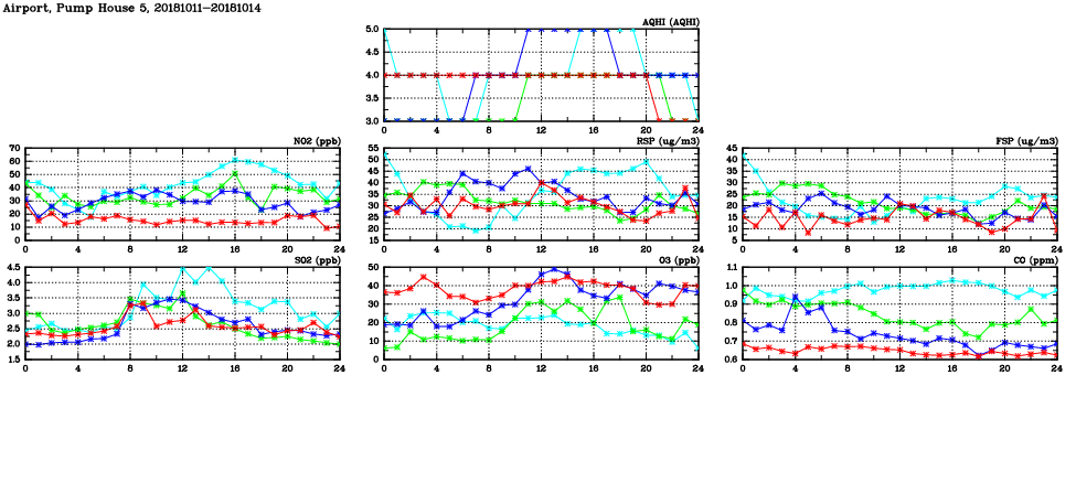 | Air Quality Data Time Series in Airport, Pump House 5 (2018/10/14) | ( Line colors: Day -3 Day -2 Day -1 Current day ) | 2D Map Current AQHI |