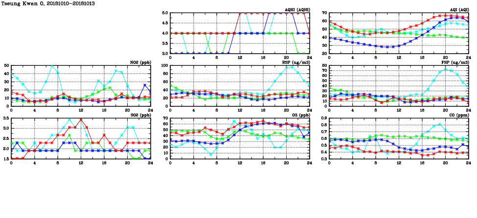 | Air Quality Data Time Series in Tseung Kwan O (2018/10/13) | ( Line colors: Day -3 Day -2 Day -1 Current day ) | 2D Map Current AQHI |