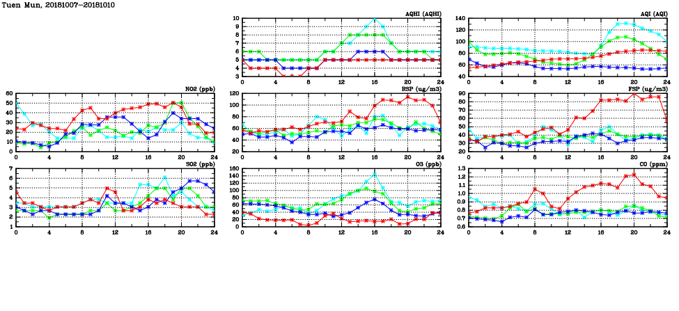 | Air Quality Data Time Series in Tuen Mun (2018/10/10) | ( Line colors: Day -3 Day -2 Day -1 Current day ) | 2D Map Current AQHI |