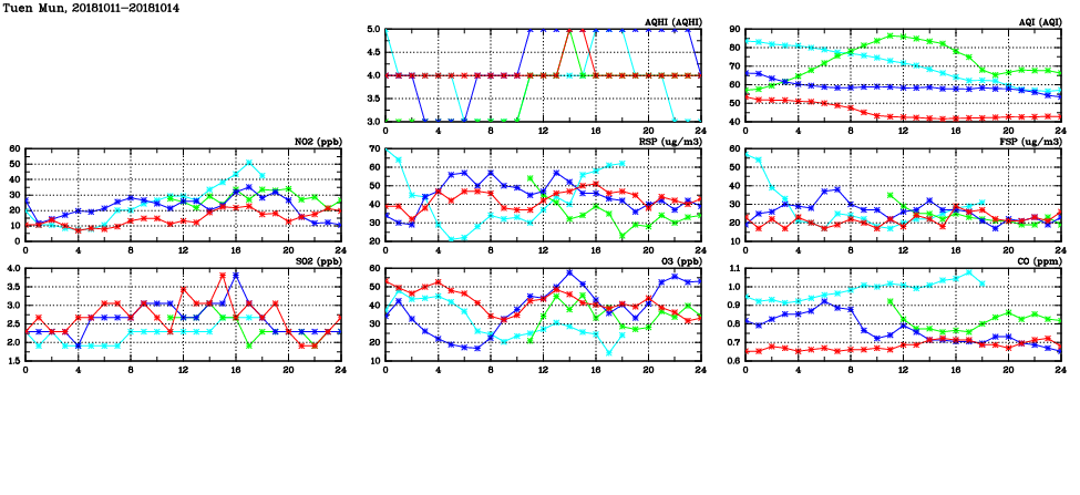 | Air Quality Data Time Series in Tuen Mun (2018/10/14) | ( Line colors: Day -3 Day -2 Day -1 Current day ) | 2D Map Current AQHI |