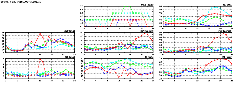 | Air Quality Data Time Series in Tsuen Wan (2018/10/10) | ( Line colors: Day -3 Day -2 Day -1 Current day ) | 2D Map Current AQHI |
