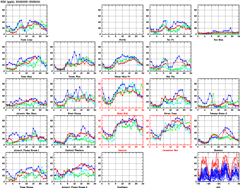 | Air Quality Data Time Series for NO2 (2018/10/11) | ( Line colors: Day -3 Day -2 Day -1 Current day ) | 2D Map Current AQHI |