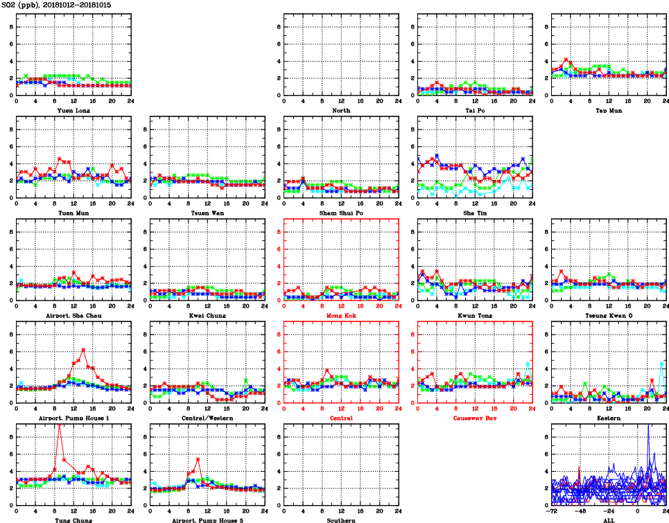| Air Quality Data Time Series for SO2 (2018/10/15) | ( Line colors: Day -3 Day -2 Day -1 Current day ) | 2D Map Current AQHI |
