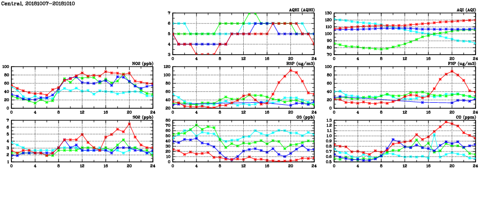 | Air Quality Data Time Series in Central (2018/10/10) | ( Line colors: Day -3 Day -2 Day -1 Current day ) | 2D Map Current AQHI |