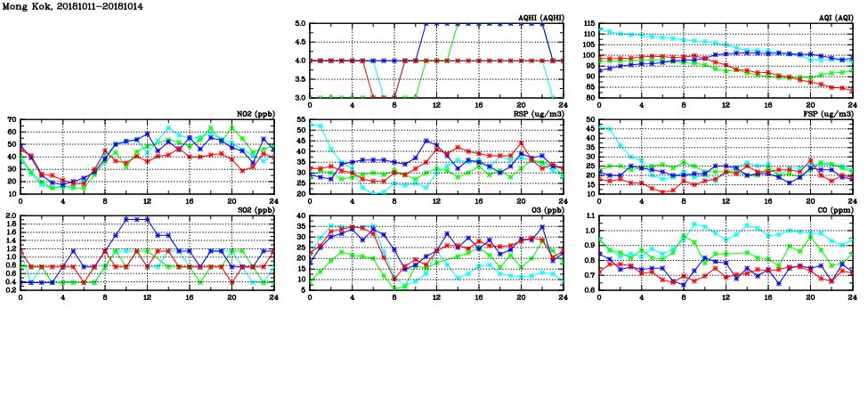 | Air Quality Data Time Series in Mong Kok (2018/10/14) | ( Line colors: Day -3 Day -2 Day -1 Current day ) | 2D Map Current AQHI |