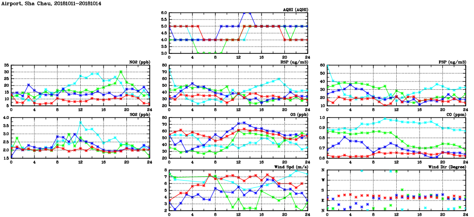| Air Quality Data Time Series in Airport, Sha Chau (2018/10/14) | ( Line colors: Day -3 Day -2 Day -1 Current day ) | 2D Map Current AQHI |