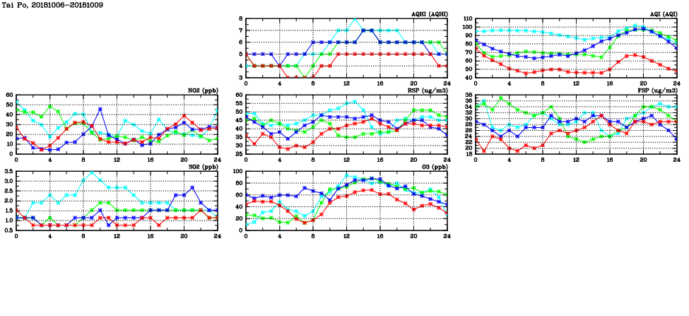| Air Quality Data Time Series in Tai Po (2018/10/09) | ( Line colors: Day -3 Day -2 Day -1 Current day ) | 2D Map Current AQHI |