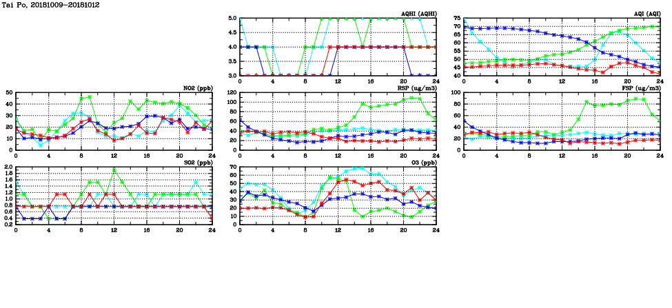 | Air Quality Data Time Series in Tai Po (2018/10/12) | ( Line colors: Day -3 Day -2 Day -1 Current day ) | 2D Map Current AQHI |
