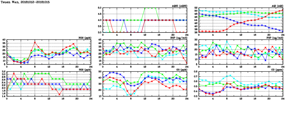 | Air Quality Data Time Series in Tsuen Wan (2018/10/15) | ( Line colors: Day -3 Day -2 Day -1 Current day ) | 2D Map Current AQHI |