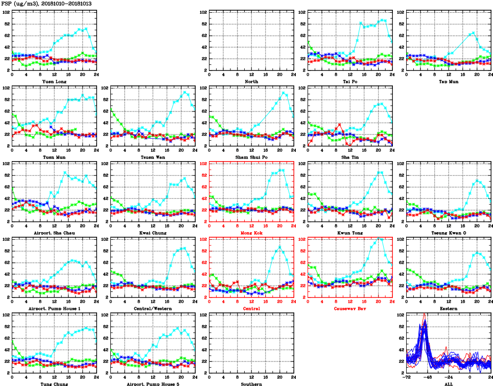 | Air Quality Data Time Series for FSP (2018/10/13) | ( Line colors: Day -3 Day -2 Day -1 Current day ) | 2D Map Current AQHI |