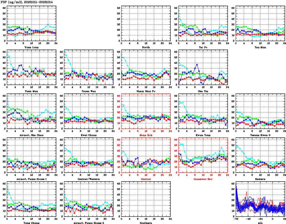 | Air Quality Data Time Series for FSP (2018/10/14) | ( Line colors: Day -3 Day -2 Day -1 Current day ) | 2D Map Current AQHI |