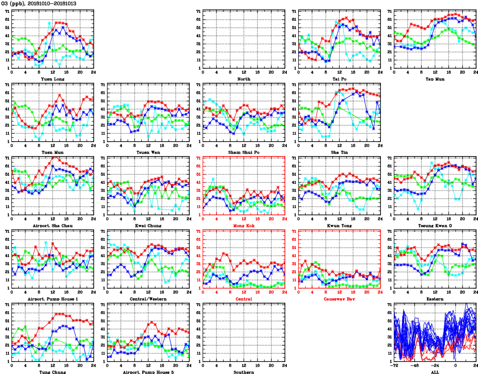 | Air Quality Data Time Series for O3 (2018/10/13) | ( Line colors: Day -3 Day -2 Day -1 Current day ) | 2D Map Current AQHI |