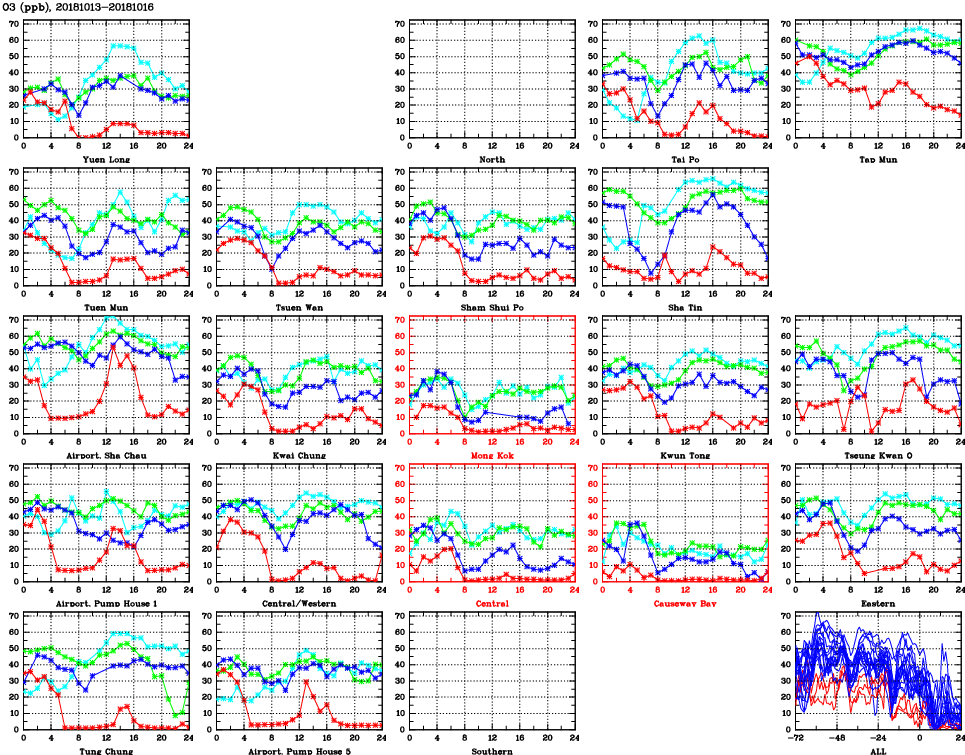 | Air Quality Data Time Series for O3 (2018/10/16) | ( Line colors: Day -3 Day -2 Day -1 Current day ) | 2D Map Current AQHI |