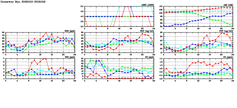 | Air Quality Data Time Series in Causeway Bay (2018/10/16) | ( Line colors: Day -3 Day -2 Day -1 Current day ) | 2D Map Current AQHI |