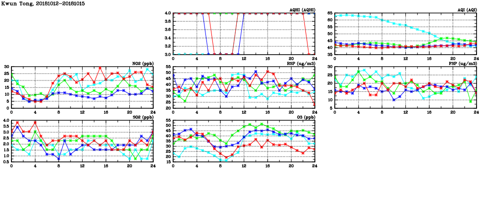 | Air Quality Data Time Series in Kwun Tong (2018/10/15) | ( Line colors: Day -3 Day -2 Day -1 Current day ) | 2D Map Current AQHI |