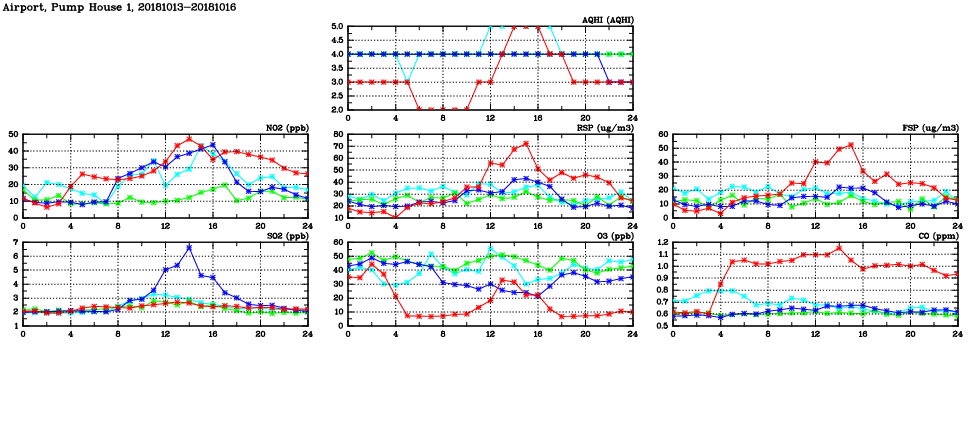 | Air Quality Data Time Series in Airport, Pump House 1 (2018/10/16) | ( Line colors: Day -3 Day -2 Day -1 Current day ) | 2D Map Current AQHI |
