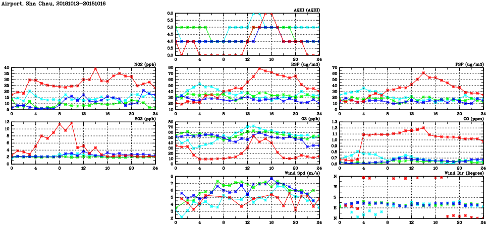 | Air Quality Data Time Series in Airport, Sha Chau (2018/10/16) | ( Line colors: Day -3 Day -2 Day -1 Current day ) | 2D Map Current AQHI |