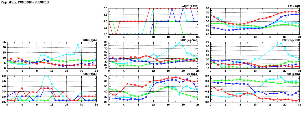 | Air Quality Data Time Series in Tap Mun (2018/10/13) | ( Line colors: Day -3 Day -2 Day -1 Current day ) | 2D Map Current AQHI |