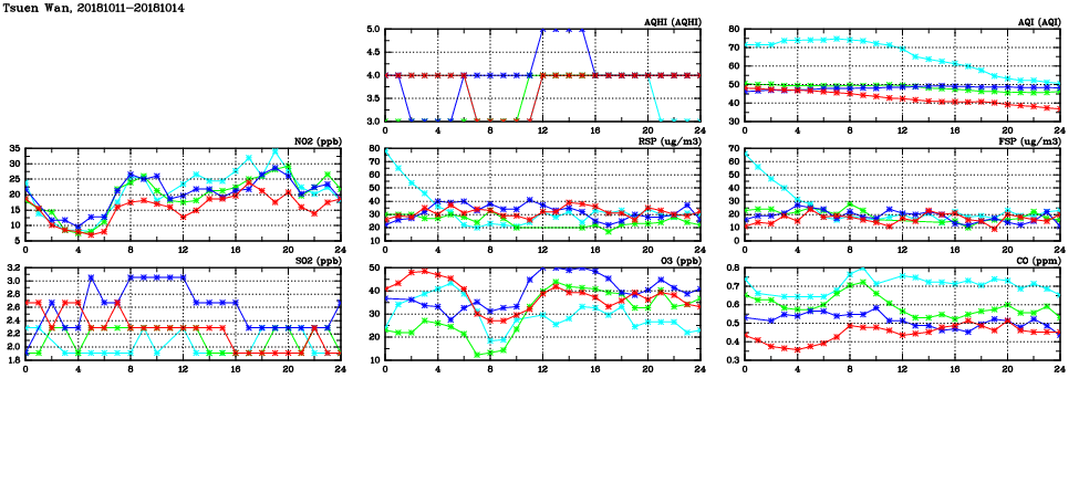 | Air Quality Data Time Series in Tsuen Wan (2018/10/14) | ( Line colors: Day -3 Day -2 Day -1 Current day ) | 2D Map Current AQHI |