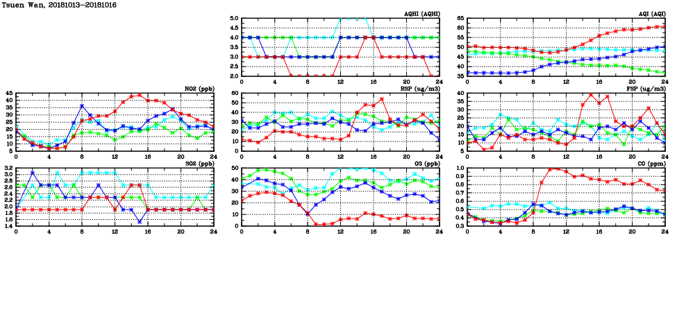 | Air Quality Data Time Series in Tsuen Wan (2018/10/16) | ( Line colors: Day -3 Day -2 Day -1 Current day ) | 2D Map Current AQHI |