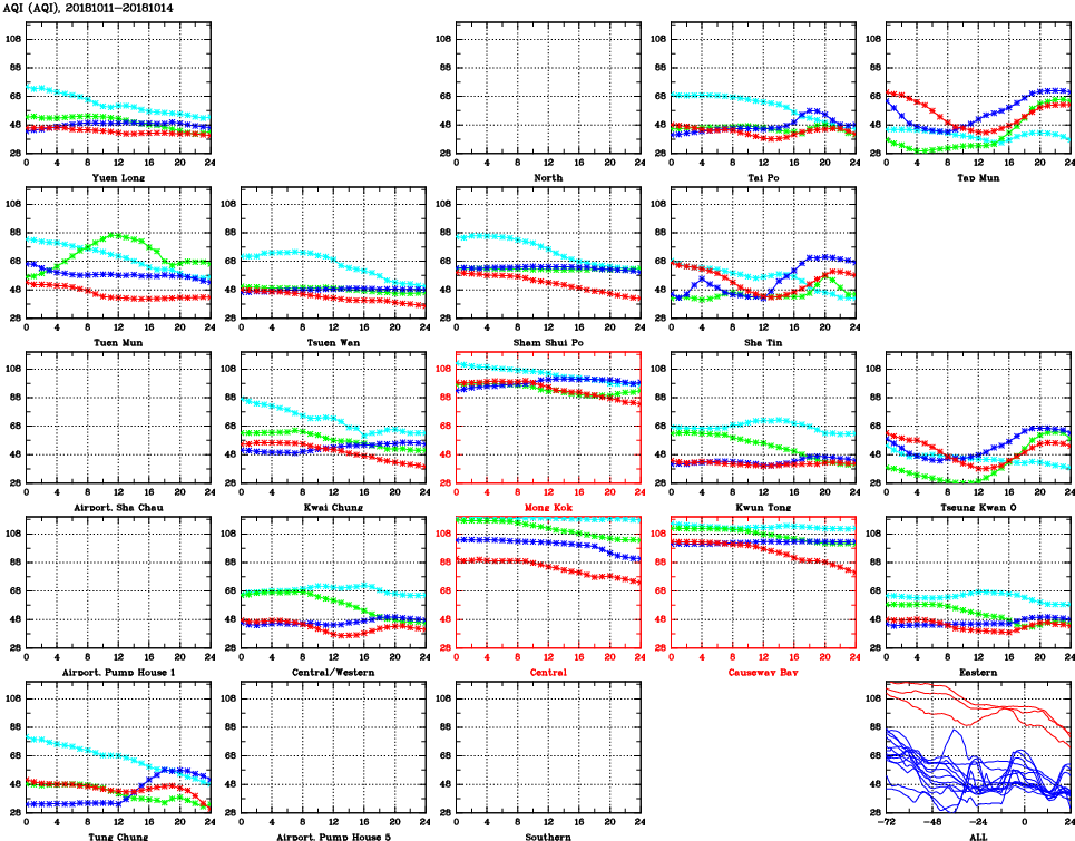 | Air Quality Data Time Series for AQI (2018/10/14) | ( Line colors: Day -3 Day -2 Day -1 Current day ) | 2D Map Current AQHI |